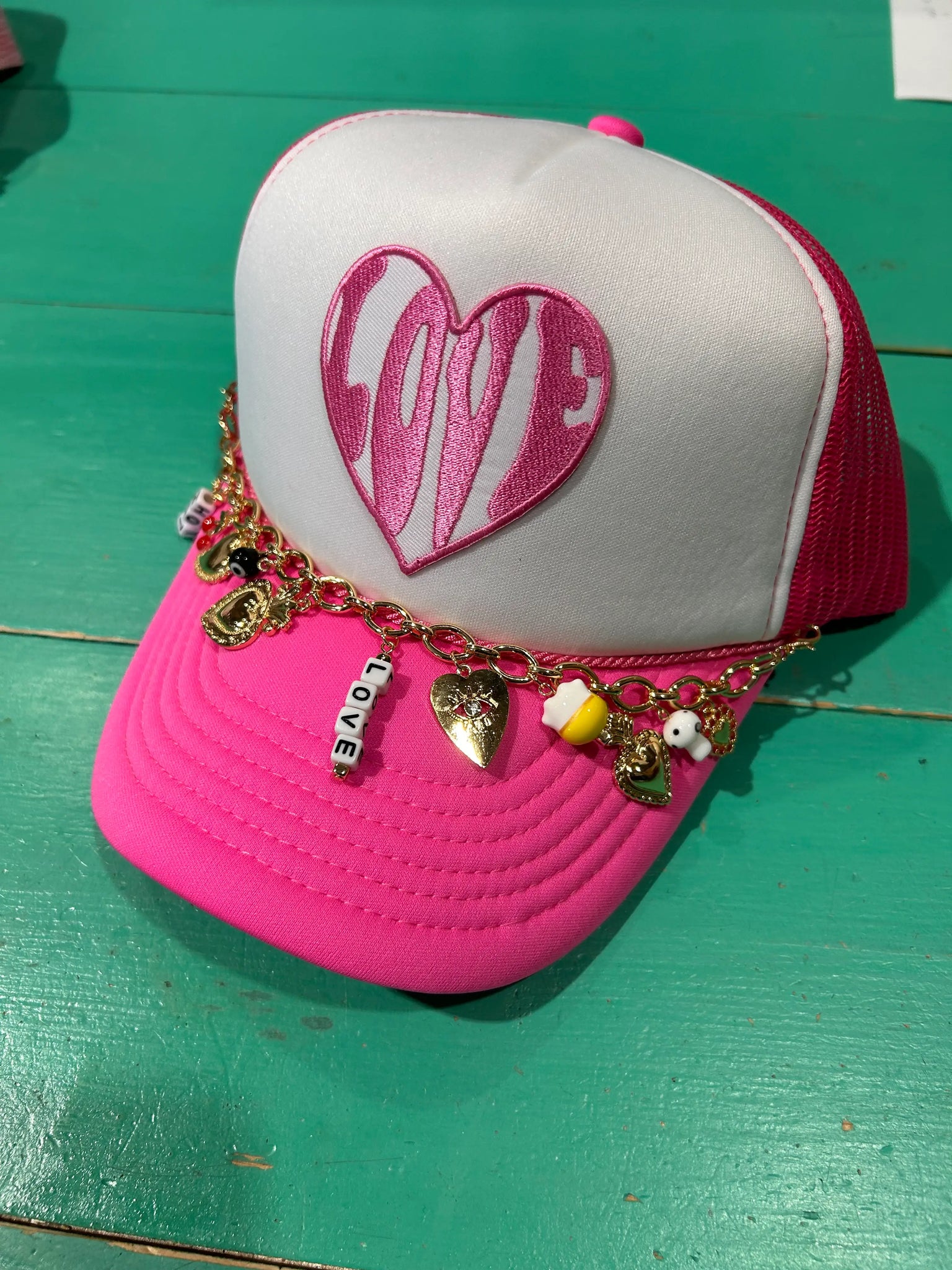 Pair with one of our trucker hat chains for the perfect look! Chains are NOT included but can be purchased separately. Chains pictured here are jumbo AB rhinestone chain, pink pearl chain, and new Hot Love charmed trucker chain.
